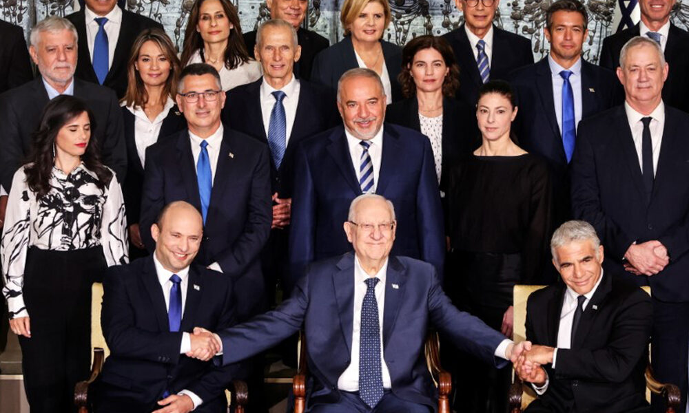 After holding its first meeting late on Sunday, Bennett’s new cabinet was invited for a traditional group photograph, showcasing incoming governments, at the official residence of President Reuven Rivlin.
