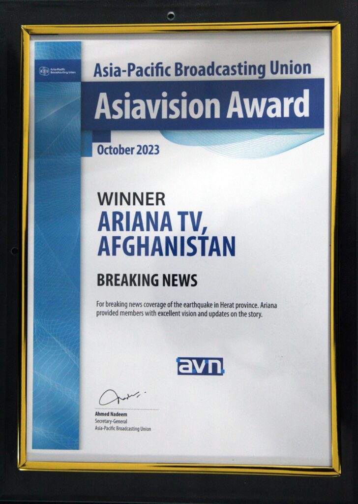According to ABU, Ariana Television and Ariana News won the sought-after “monthly prize for the timeliness of its coverage of the earthquake that affected 13 villages in western Herat province.