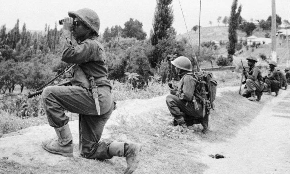 نیروهای هندی در جریان دومین جنگ بر سر کشمیر در حال حرکت علیه نیروهای چریکی در کشمیر به تاریخ ۶ سپتمبر سال ۱۹۶۵ اند. (آسوشیتدپرس)