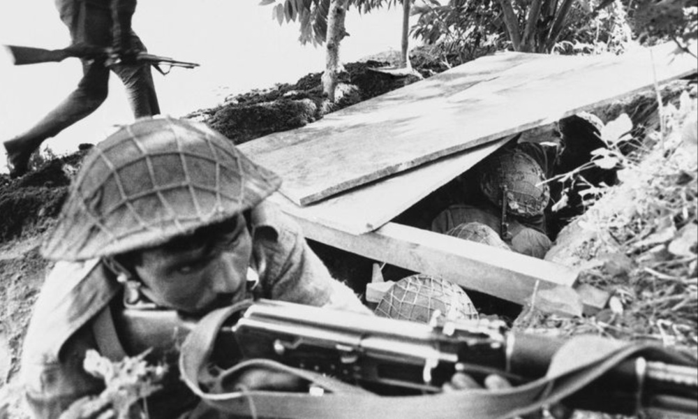 یک سرباز پاکستانی اسلحه خود را نشانه گرفته است، در حالی که سرباز دیگری هنگام گلولهباران مواضع پاکستانی در پاکستان شرقی توسط نیروهای هندی، بهسوی پناهگاه میدود. تاریخ: دسمبر ۲ سال ۱۹۷۱ (آسوشیتدپرس)