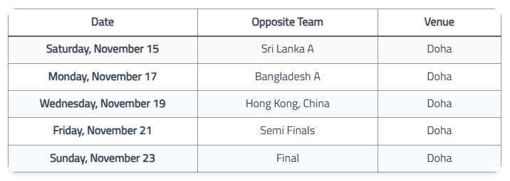 ملیپوشان کشور نخستین دیدار خود را در ۱۵ نومبر در برابر تیم الف سریلانکا برگزار خواهند کرد.