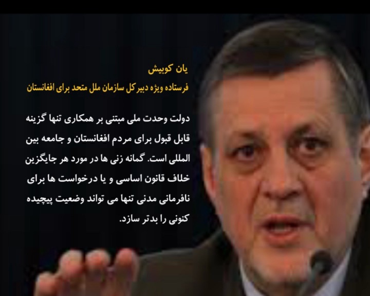 یان کوبیش فرستاده ویژه دبیرکل سازمان ملل متحد در افغانستان گفت:” دولت وحدت ملی مبتنی بر همکاری تنها گزینه قابل قبول برای مردم افغانستان و جامعه بین المللی است. گمانه زنی ها در مورد هر جایگزین دیگری خلاف قانون اساسی خواهد بود. زیرا نافرمانی مدنی تنها می تواند وضعیت پیچیده کنونی را بدتر سازد”.