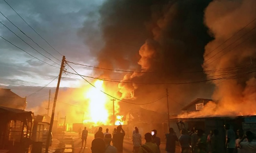 A video shared widely on social media, purportedly of the fire, shows a tower of black smoke and flames spewing into the air above what appears to be a market place as shocked people watch from a safe distance.