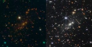 These distorted background galaxies can be clearly seen as lines and arcs throughout this image. The field is already spectacular in Hubble images (left), but the JWST near-infrared image (right) reveals a wealth of extra detail, including hundreds of distant galaxies too faint or too red to be detected by its predecessor.