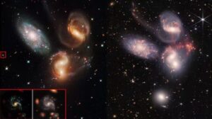 These images depict a spectacular group of galaxies known as Stephan’s Quintet, a group that has long been of interest to astronomers studying the way colliding galaxies interact with one another gravitationally.