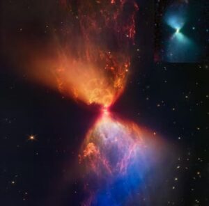 This image depicts another act of galactic creation within the Milky Way. This hourglass-shaped structure is a cloud of dust and gas surrounding a star in the act of formation – a protostar called L1527.