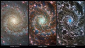 These images of the so-called Phantom Galaxy or M74 reveal the power of JWST not only as the latest and greatest of astronomical instruments but as a valuable complement to other great tools. The middle panel here combines visible light from Hubble with infrared from Webb, allowing us to see how starlight (via Hubble) and gas and dust (via JWST) together shape this remarkable galaxy.