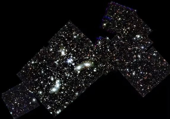 This image is a mosaic (many individual images stitched together) centered on the giant Abell 2744 galaxy cluster, colloquially known as “Pandora’s Cluster”. The sheer number and variety of sources that the JWST can detect are mind-boggling; with the exception of a handful of foreground stars, every spot of light represents an entire galaxy.