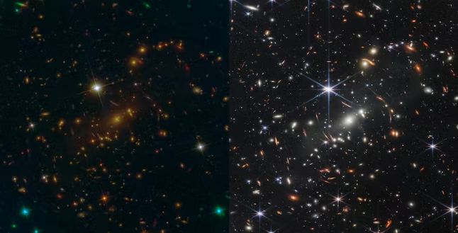 These distorted background galaxies can be clearly seen as lines and arcs throughout this image. The field is already spectacular in Hubble images (left), but the JWST near-infrared image (right) reveals a wealth of extra detail, including hundreds of distant galaxies too faint or too red to be detected by its predecessor.