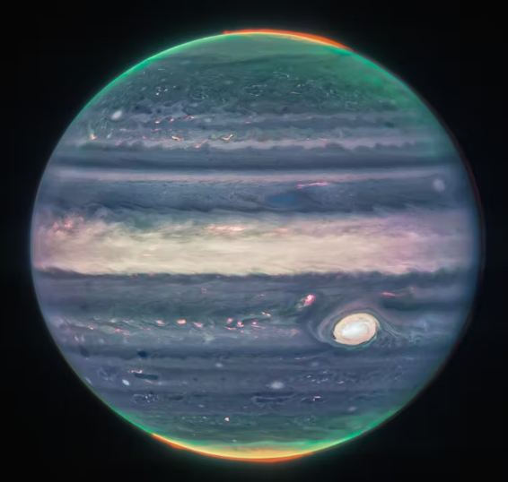This image was extremely difficult to achieve due to the fast motion of Jupiter across the sky relative to the stars and because of its fast rotation. The success proved the Webb telescope’s ability to track difficult astronomical targets extremely well.