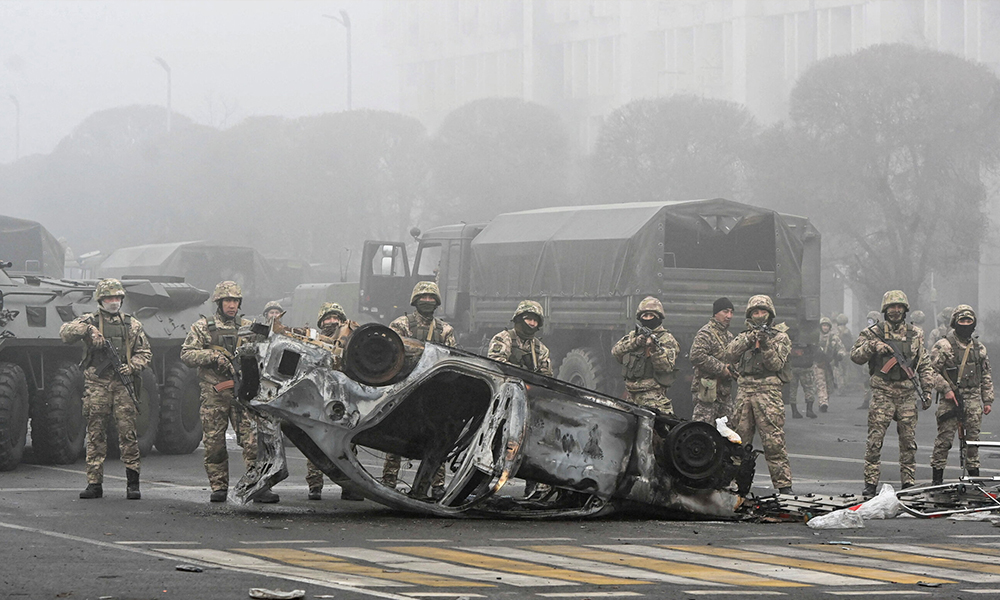 A day after Moscow sent paratroopers to help crush the insurrection, police were patrolling the debris-strewn streets of Almaty, although some gunfire could still be heard.