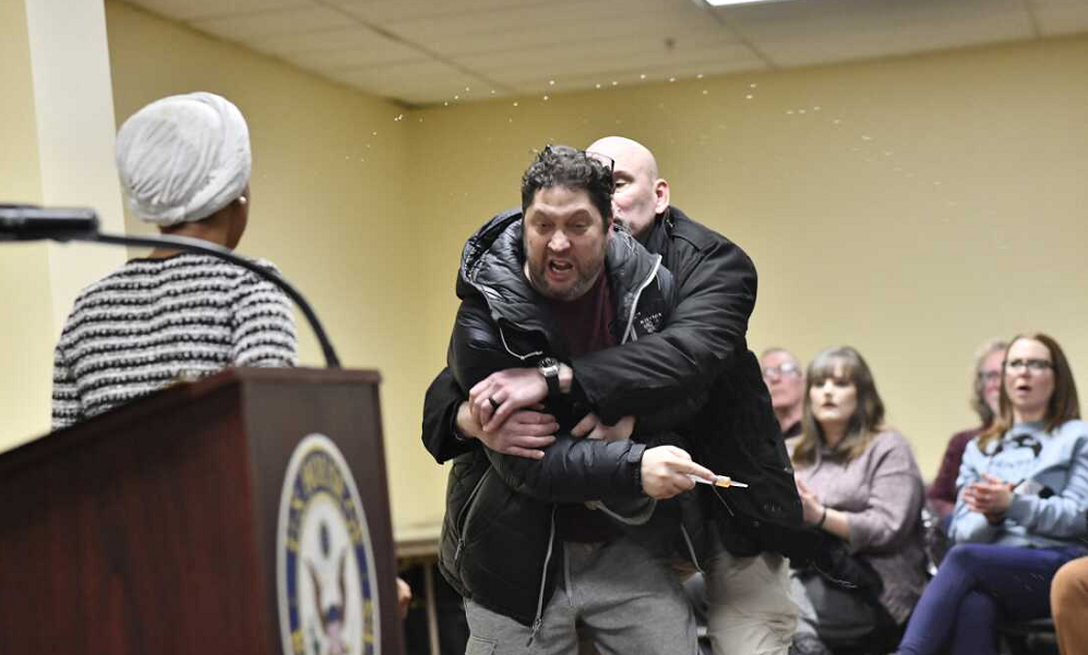 Moments later, a man seated in a front row stepped toward her and sprayed her with the contents of what police described as a syringe, telling Omar, “You must resign.”