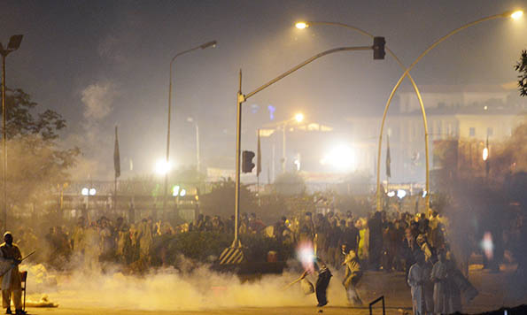 په اسلام آباد کې پولیسو د دولت پر مخالفو لارویون کوونکیو پلاستیکي مرمۍ او اوښکې بهونکی گازکارولی، چې تر اوسه ترې له ۴۵۰ ډېر ټپیان روغتونونو ته وړل شوي او ۱۰۰ نور لاریون کوونکي نیول شوي؛ خود ځینو خبري سرچینو په حواله ۲۶ پولیس هم ټپیان شوي دي.
