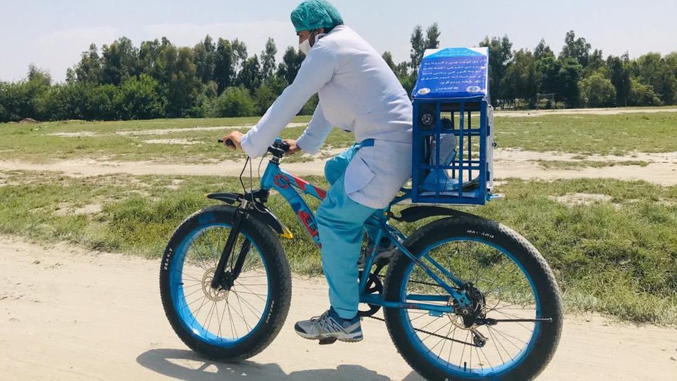 دا ځوان له ښاره لرې په کلیو او بانډو کې پر بايسکل له کورونا د خونديتوب ګرځنده رضاکاره کمپاين کوي چیرته چې اړتیا یې ډېره لیدلی شي.