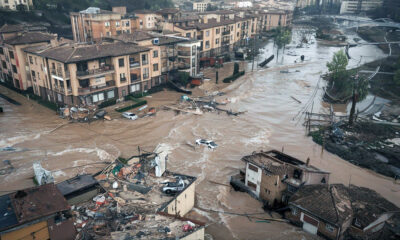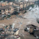 انځورونه ښیې، چې د الباسیټه په لیټور ښار کې خټینې اوبه څپې وهي او موټر دېخوا او هخوا کیږي.