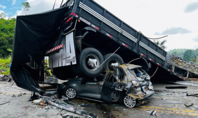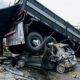 The truck driver fled the scene, and three occupants of a car that collided with the truck and became trapped underneath survived the accident, said the...